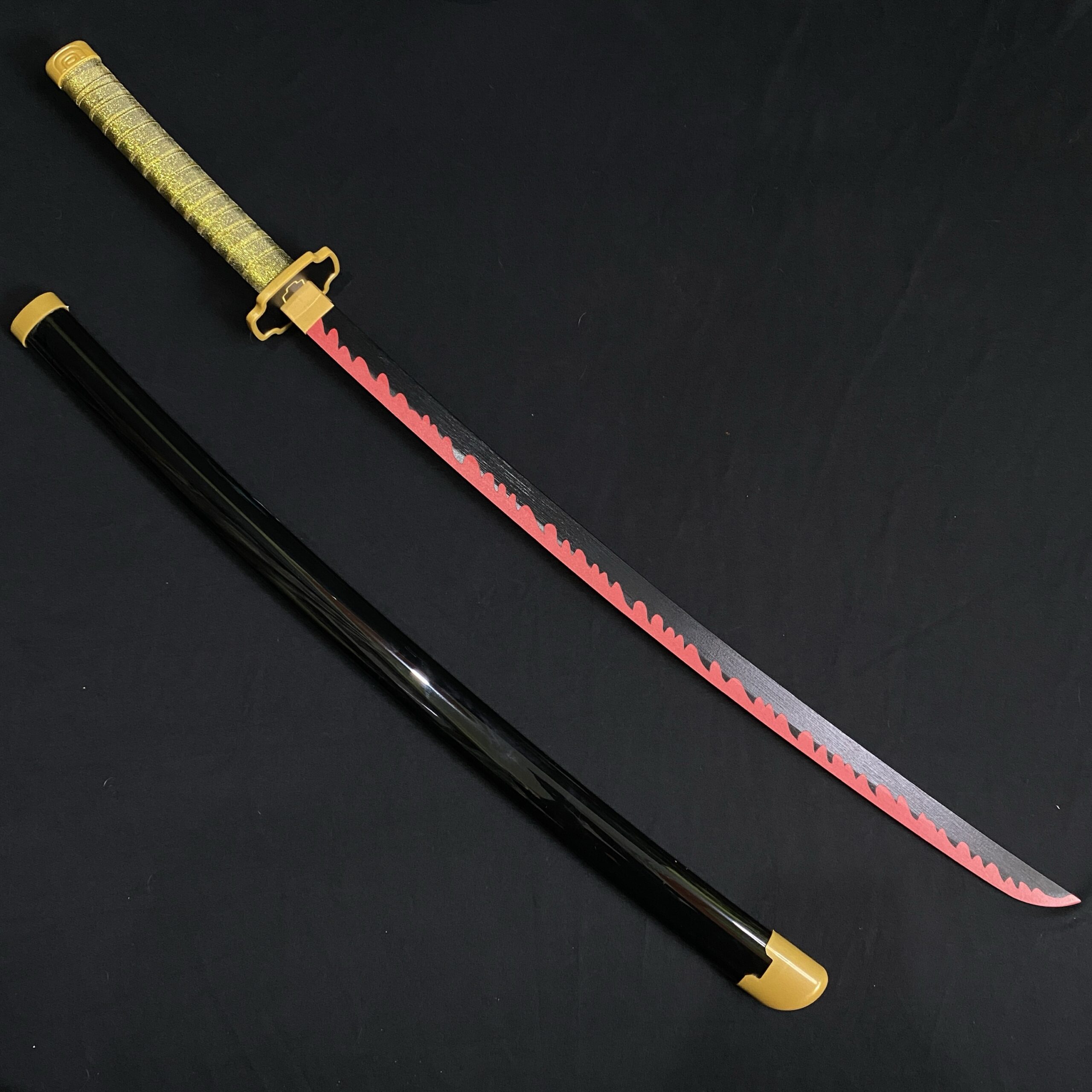 • Authentic Design: A faithful recreation of Kyojuro Rengoku’s Nichirin Blade from the anime Demon Slayer: Kimetsu no Yaiba, featuring its distinctive red and orange flame pattern on the blade.
